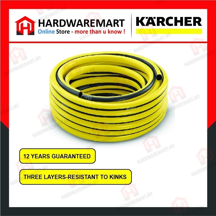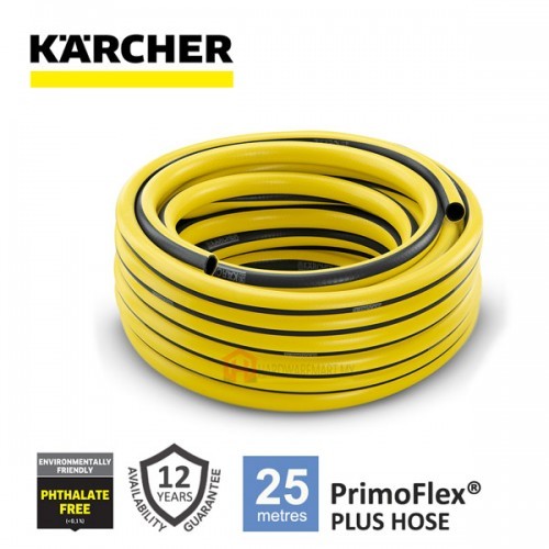 The PrimoFlex® quality hose, which measures 5/8" in diameter and 25 m in length, is perfect for watering areas and gardens of any size. The three-layer garden hose with pressure-resistant reinforcement mesh is free from phthalates (< 0.1%), cadmium, barium and lead – meaning it contains absolutely no substances that are harmful to health. The weather-resistant anti-UV outer layer protects the material and the opaque middle layer prevents algae from building up inside the hose. The bursting pressure is 24 bar. The hose also boasts an impressive temperature resistance of between -20 and 65 °C. We offer a 12-year guarantee for this garden hose. The garden hoses in the Kärcher watering line are exceptionally flexible, robust, and resistant to kinks. Long lifetime plus easy handling equals a winning combination. Kärcher: The wise choice for your watering needs.