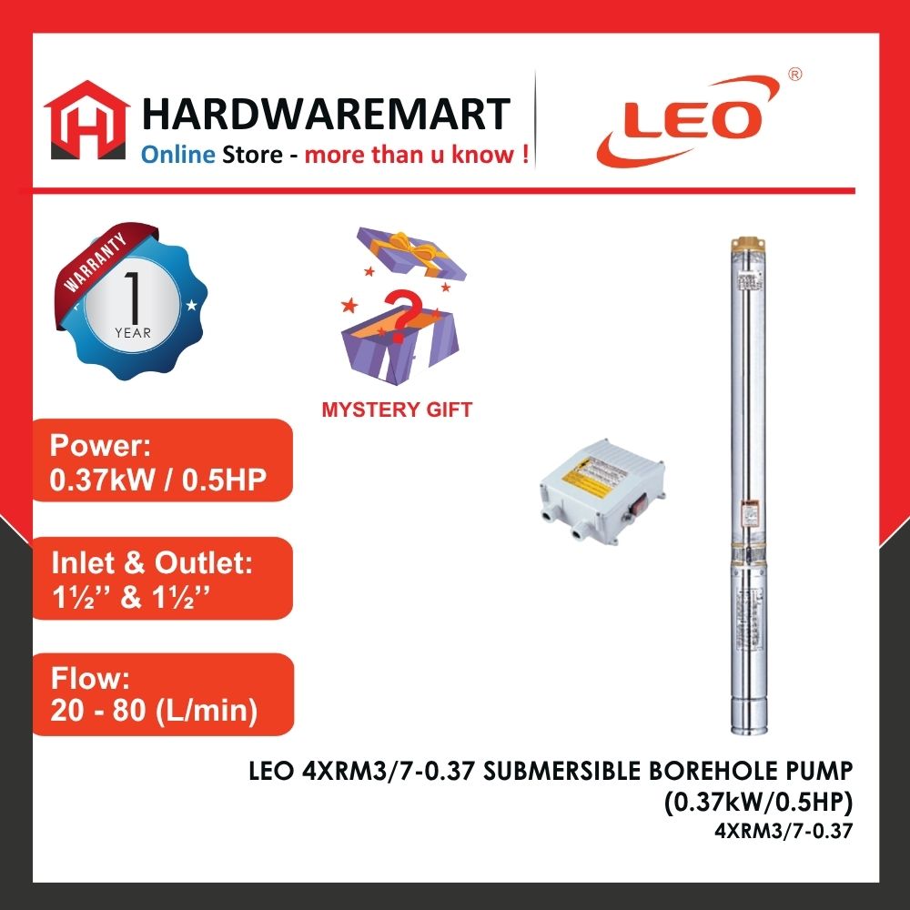 -29% LEO LEO 4XRM3/7-0.37 SUBMERSIBLE BOREHOLE PUMP PLANTATION Pam Air Perladangan [1 PHASE] (0.37kW/0.5HP) Brand: LEO Pump LEO SINGLE PHASE 4XRM3/7-0.37 SUBMERSIBLE BOREHOLE PUMP (0.37kW/0.5HP) Power: 0.37kW / 0.5HP Flow: 20-80 L/min Head: 40m-12m Max suction: 80m Outlet: 1½’’ & 1½’’ RM795.00 Original price was: RM795.00.RM572.40Current price is: RM572.40. Add to cart