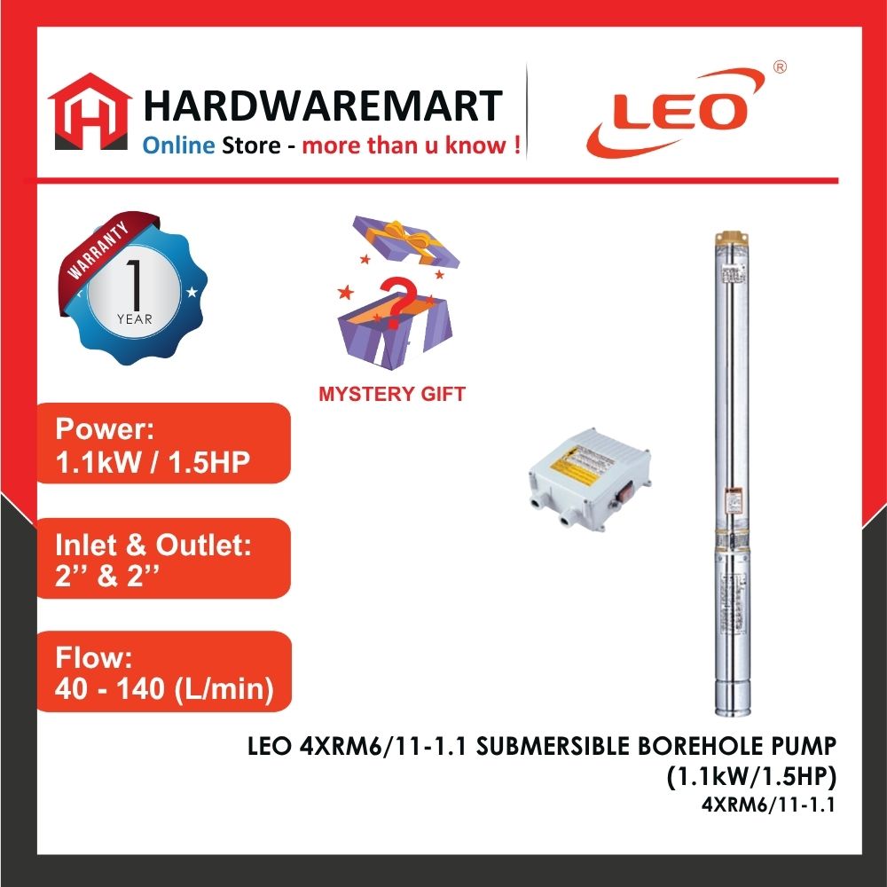 -20% LEO LEO 4XRM6/11-1.1 SUBMERSIBLE BOREHOLE PUMP PLANTATION Pam Air Perladangan [1 PHASE] (1.1kW/1.5HP) Brand: LEO PumpLEO SINGLE PHASE 4XRM6/11-1.1 SUBMERSIBLE BOREHOLE PUMP (1.1kW/1.5HP)Power: 1.1kW / 1.5HPFlow: 40-140 L/minHead: 70m-20mMax suction: 80mOutlet: 2’’ x 2’’ RM1,065.00 Original price was: RM1,065.00.RM852.00Current price is: RM852.00. Add to cart