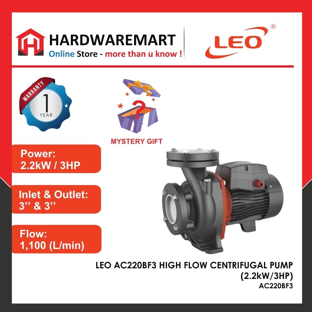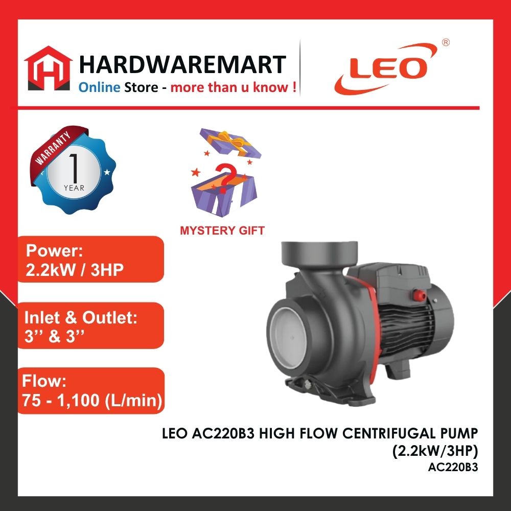 Brand: LEO Pump LEO THREE PHASE AC220B3 HIGH FLOW CENTRIFUGAL PUMP (2.2kW/3HP) Power: 2.2kW / 3HP Flow: 75-1100 L/min Head: 18.5m-6.5m Max suction: 8m Outlet: 3” x 3”