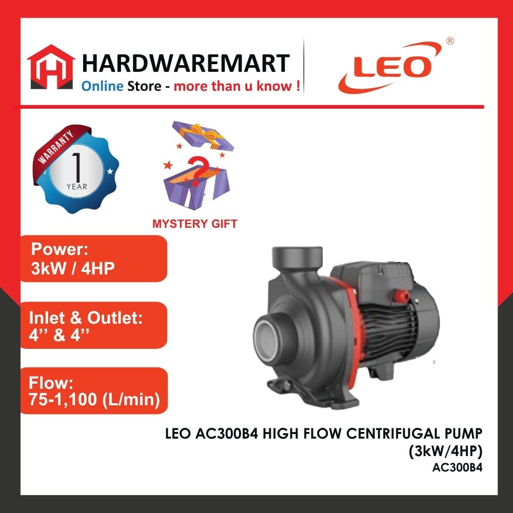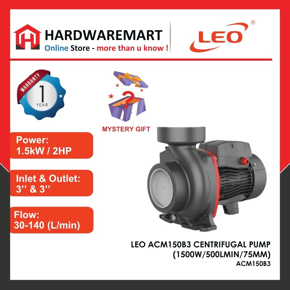Brand: LEO Pump LEO SINGLE PHASE ACM300B3 HIGH FLOW CENTRIFUGAL PUMP (3kW/4HP) Power: 3kW / 4HP Flow: 75-1000 L/min Head: 20.5m-10.5 Max suction: 8m Outlet: 3” x 3”